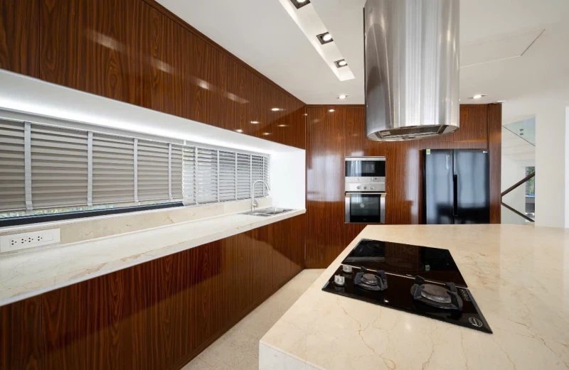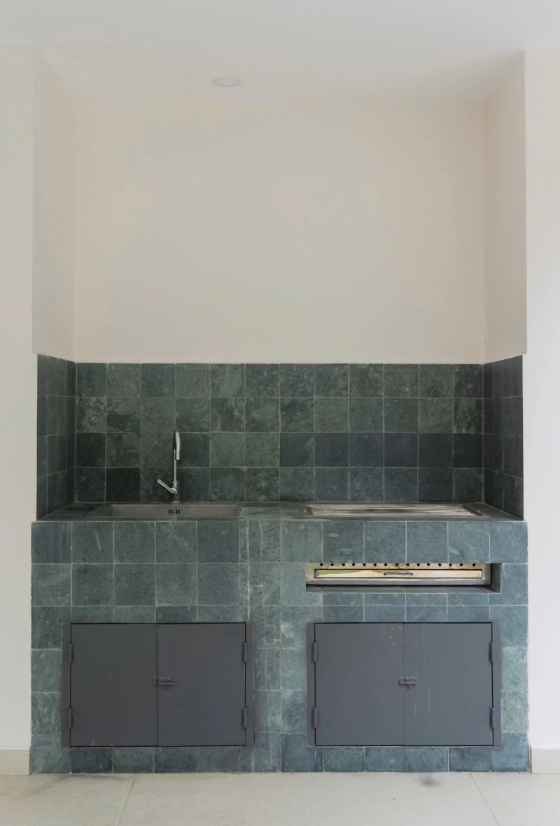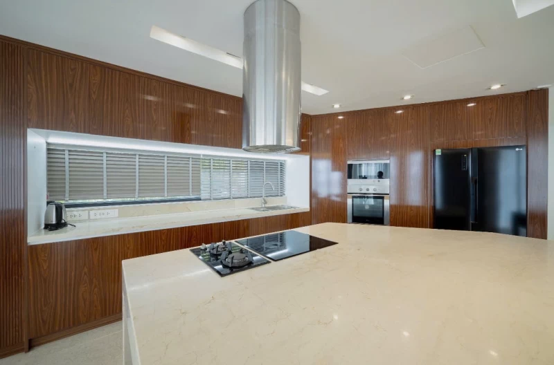 * Nhà bếp đầy đủ dụng cụ nấu nướng ăn uống.